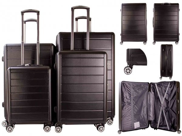 Model: T-HC-07 BLACK SET OF 4 T-HC-07 BLACK SET OF 4 TRAVEL TROLLEY SUITCASE New 4 Wheel 360-degree hard case Suitcase Cabin Trolley -4x 360 DEGREE SPINNER WHEELS -FULLY LINED -LIGHTWEIGHT -PERFECT GLIDE SYSTEM -STRONG AND DURABLE -PUSH-BUTTON TROLLEY SYSTEM -CROSS BELT INTERIOR -SCRATCH-RESISTANT OUTER SHELL -COMBINATION LOCK -Exterior Material Made of 100% strong plastic = Lightweight Yet Durable! -Strong Metal Zippers – Top carry handle for easy grip and easy lifting -One big compartment with buckle locks for holding the clothes. Dimensions :(including Wheels and Fittings): 87cm (32 inches) SIZE: 87X54X32cm (32″X21.3″X12.6″inches) Volume: 132L Weight: 4.8 KGS 77cm (28 inches) SIZE: 77X49X29cm (28″X19.3″X11.4″inches) Volume: 95. 4L Weight: 4KGS 67cm (24 inches) SIZE: Size: 67X44X26cm (24″X17.3″X10.2″ inches) Volume:64L Weight: 3.2KGS 55CM (19 inches) Size: 55X38X21cm (19″X15″X8.3″ inches) Volume: 38.5L Weight: 2.5KGS Barcode – 5053183 075711 Product 7190/7423