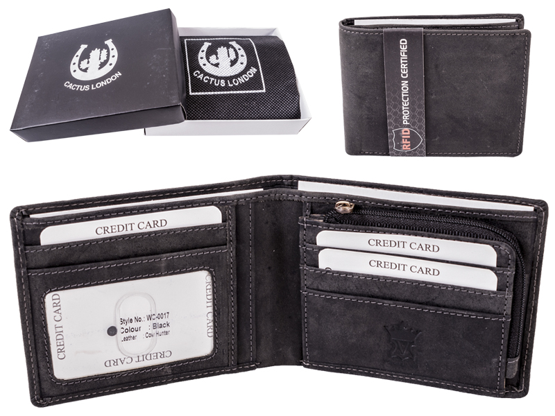 This is a stylish cow hunter leather wallet which comes in a beautiful prsentation box and is RFID protected.The wallet opens to reveal multiple credit card slots and an ID window. It has 3 receipt pouches and a zipped up coin compartment. The wallet also compromises of two note/cheque compartments. The wallet is fully RFID protected making it impossible for fraduelent activity to happen when out and about.
